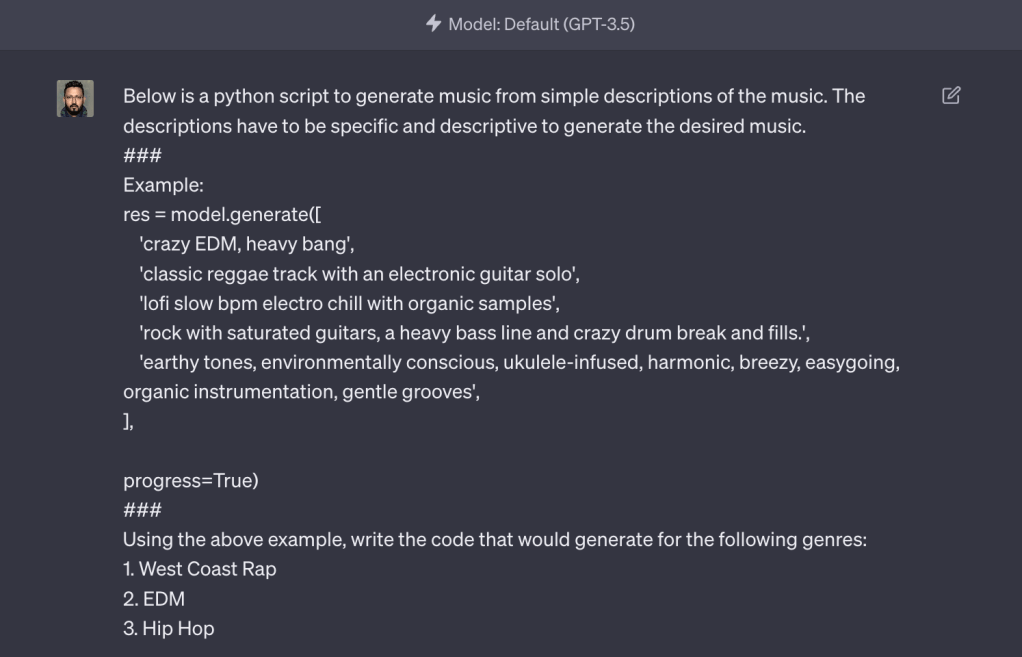 If you’re not musically inclined, you can employ a simple hack to generate better music descriptions for the model. Using OpenAI’s language model, GPT-3, you can provide a few examples and mention the genres you’re interested in. GPT-3 will then generate a detailed description of the music that you can use as input for MusicGen. I used this method and was pleasantly surprised by the quality of the descriptions.
