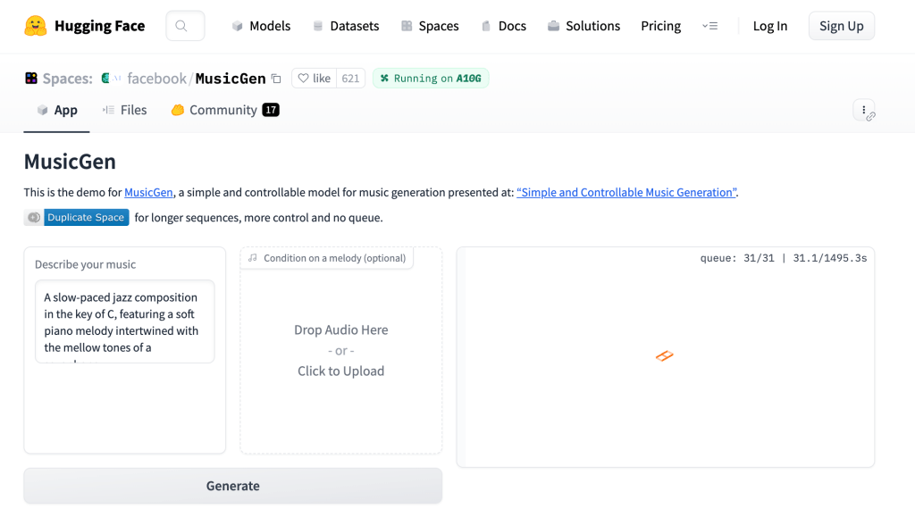 My experience with this tool was remarkable. As a jazz aficionado, I began my journey by feeding MusicGen a simple instruction: “An upbeat jazz composition in the key of C, featuring a soft piano melody intertwined with the mellow tones of a saxophone with bass”. To my delight, MusicGen composed a beautiful piece that was rich in tone, depth, and complexity. Listening to my very own jazz composition was an exhilarating experience.